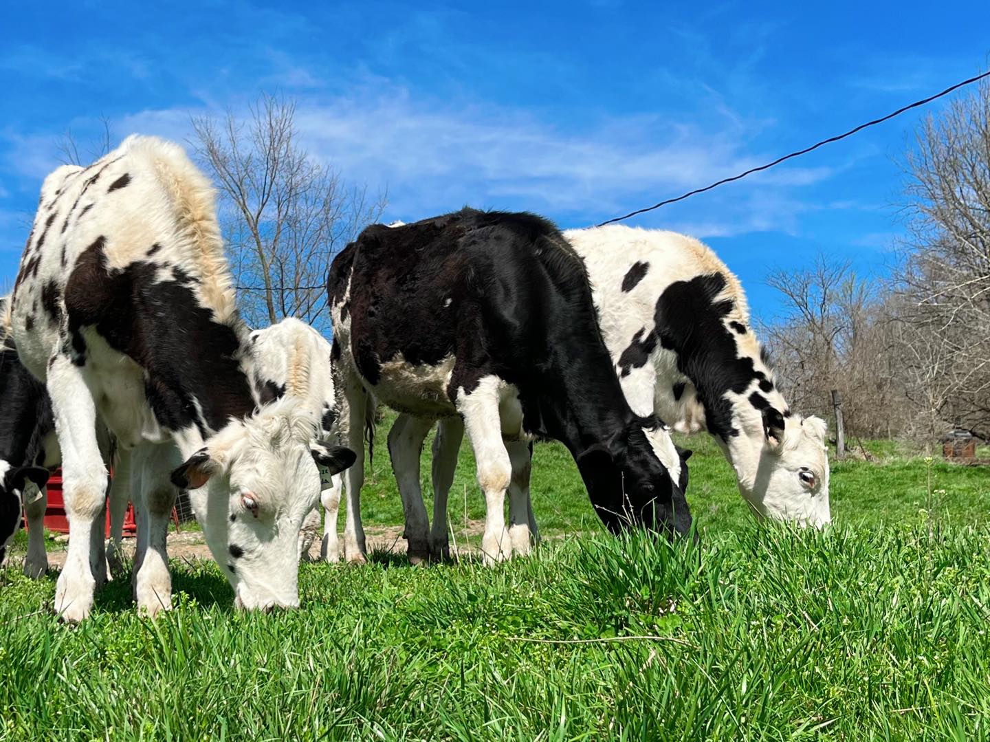 They are fed a TMR (Total Mixed Ration) with feedstocks we grow on our farm and are out on pasture in seasonable weather evenings. Our nutritionist helps us to create a perfect diet for them, so they get all the nutrients they need! During winter (when the grass is not growing or available for the cows to graze), we feed them grass, alfalfa, and clover grown on our farm, that we harvest in the growing season along with protein and minerals.